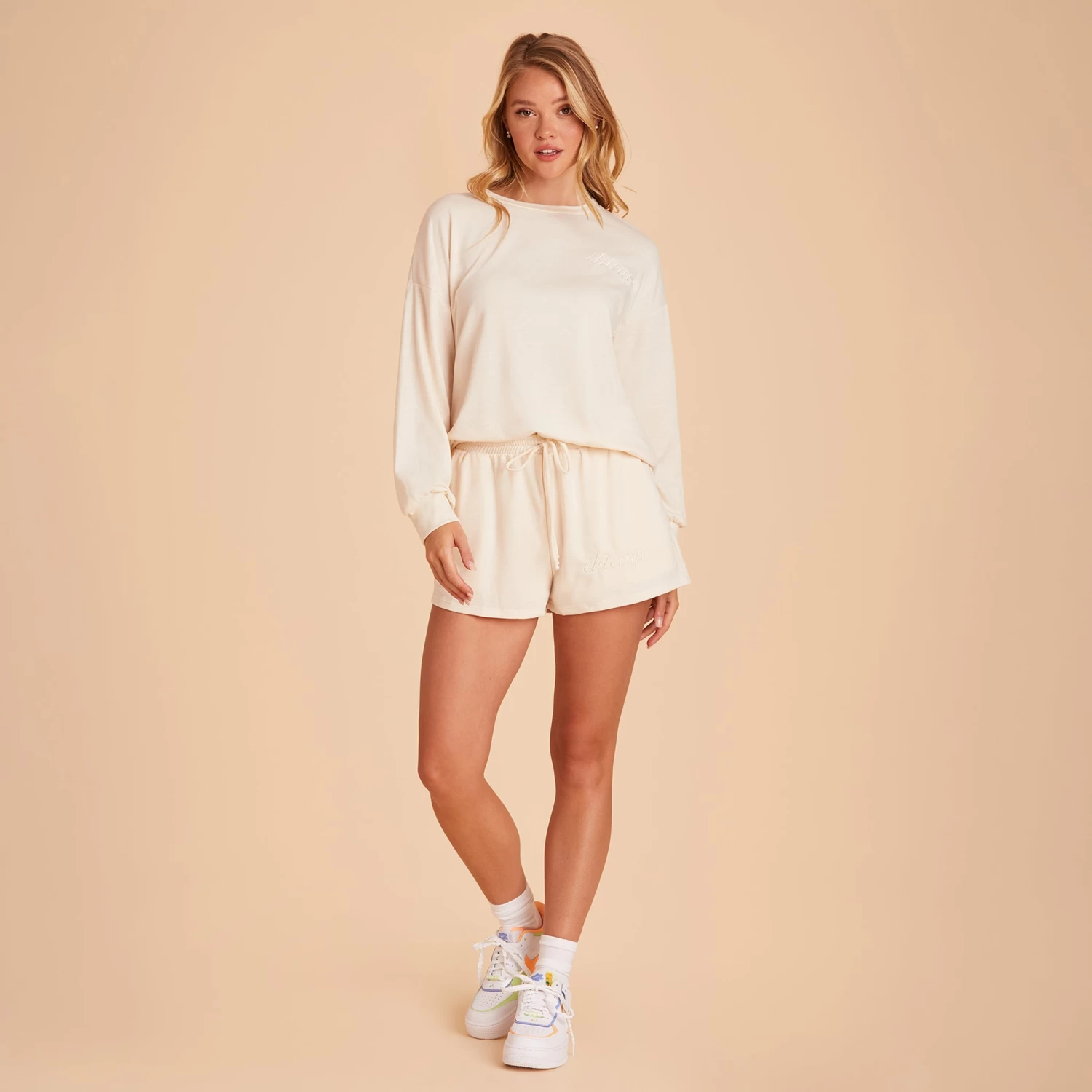 On chilly mornings, there’s nothing quite as comfortable as a crew neck sweatshirt. Personalize these with your bridesmaids’ monograms, your wedding slogan, or an inside joke. Pair these with our coordinated sweat shorts for the chillest getting ready photos of all time.