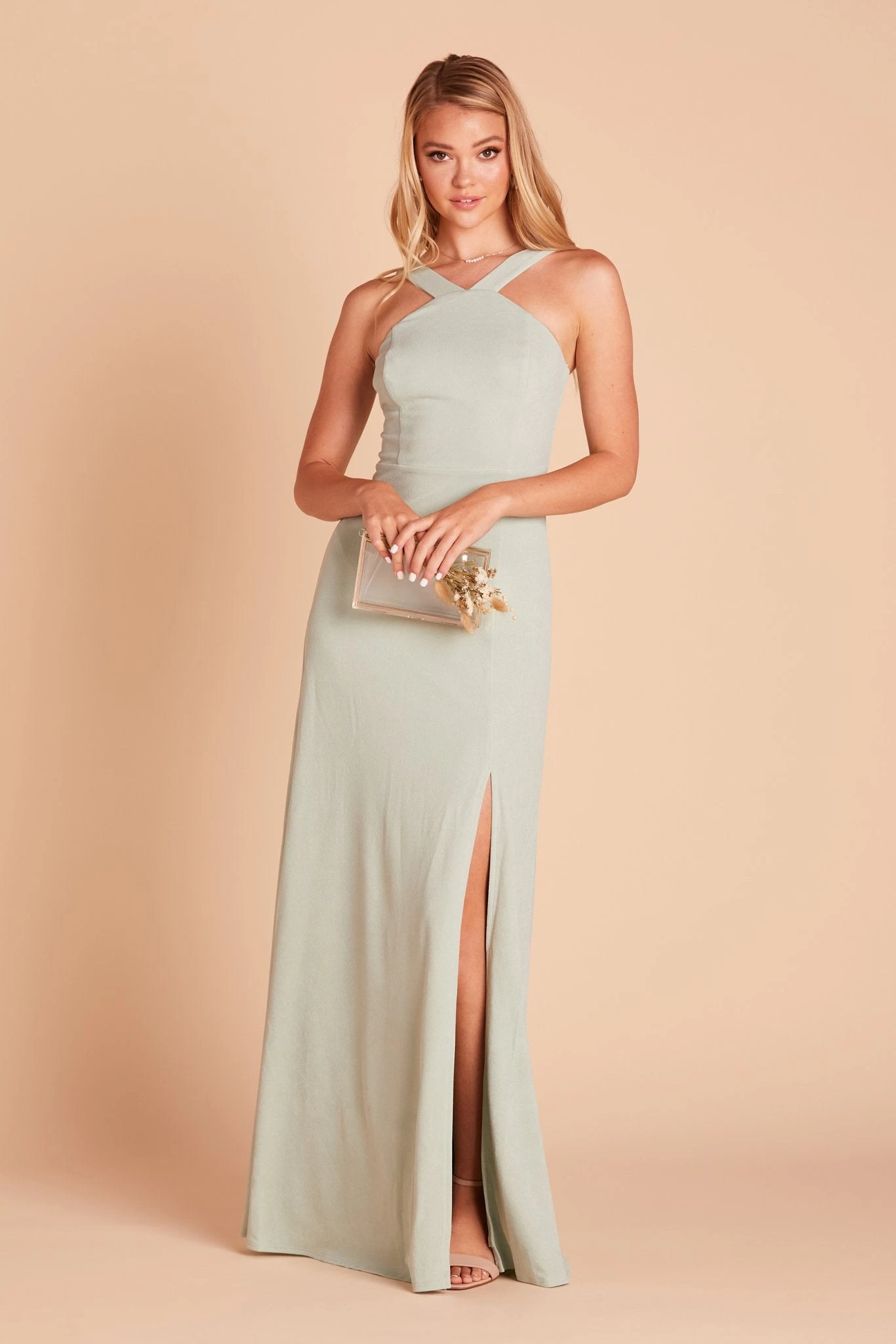 A fresh update on the halter look, the Gene crepe bridesmaid dress features an edgy criss-cross halter with flat, wide straps that highlight your shoulders and also brings a bit of the bodycon vibe on top (without it being overly sexy). She’s sleek, seductive, and definitely knows how to party. Pair her with a soft up-do to balance out the modern look while showing off the shoulders, or go for long, loose waves that add a touch of romance.