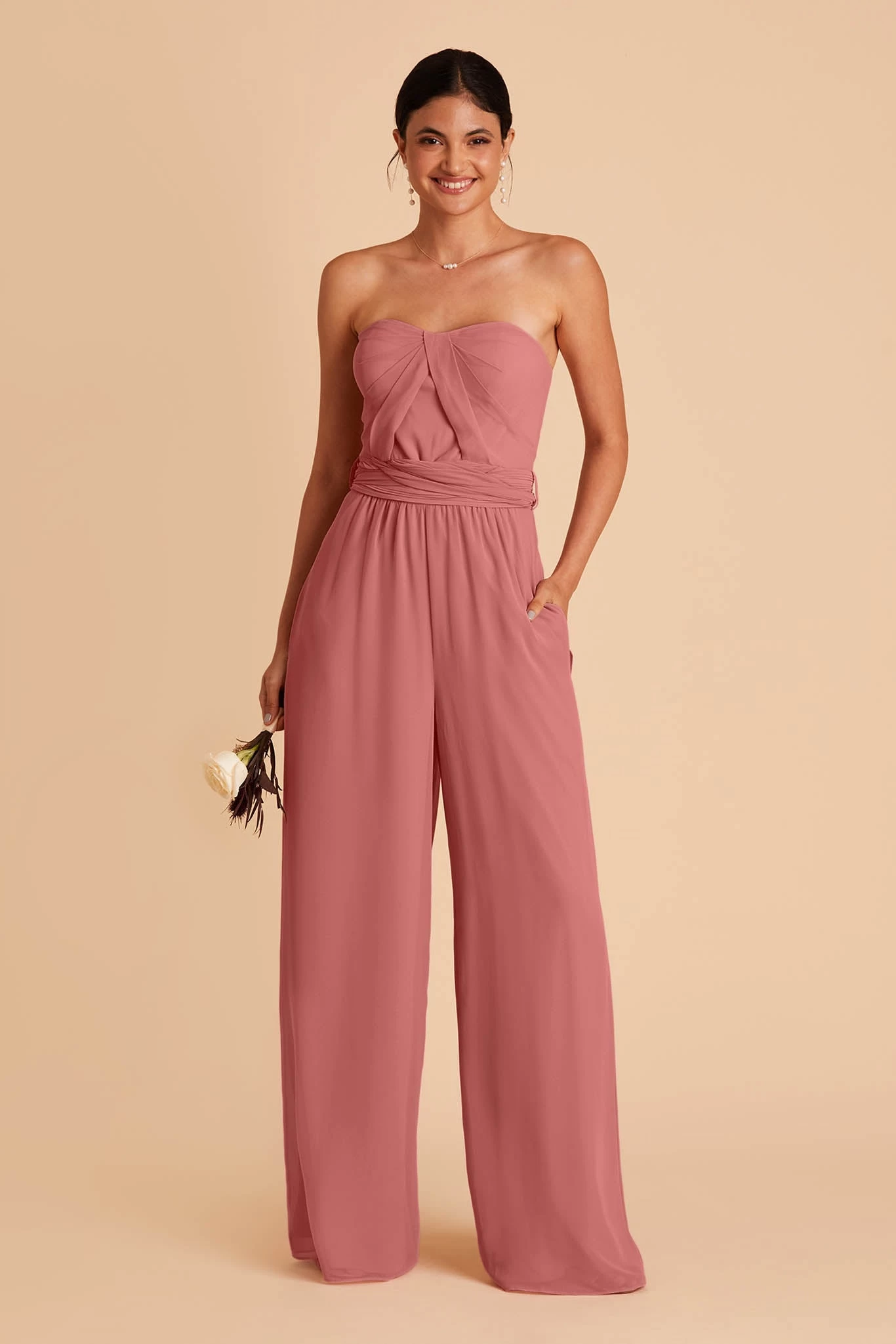On top, Gigi is reminiscent of our Grace Convertible Dress. She has a pleated sweetheart bodice and two extra-long streamers that allow you to create a near-endless number of necklines. Gigi has bra cups for extra support and hidden pockets, so you’re never too far from your lip gloss. Just a note, the spaghetti straps are super long, so you might want to alter them, depending on which way you decide to arrange the top. On the bottom, she’s got PANTS! Gigi is our very first bridesmaid jumpsuit and needless to say, we’re so in love.