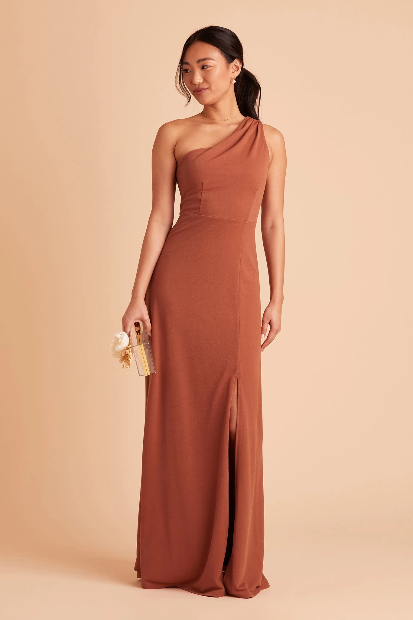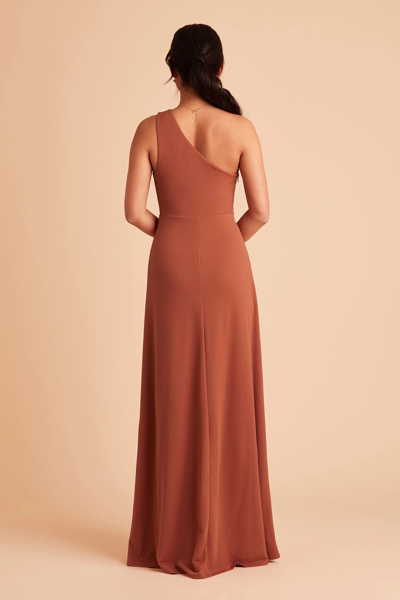 We love a good goddess vibe and this crepe bridesmaid dress does it a newfangled way thanks to our stretchy performance fabric. This one-shoulder bridesmaid dress features soft pleating that fades out at the top of the chest, giving off a proper ladylike vibe and makes for a stellar choice for bridesmaids who tend toward a modest look.