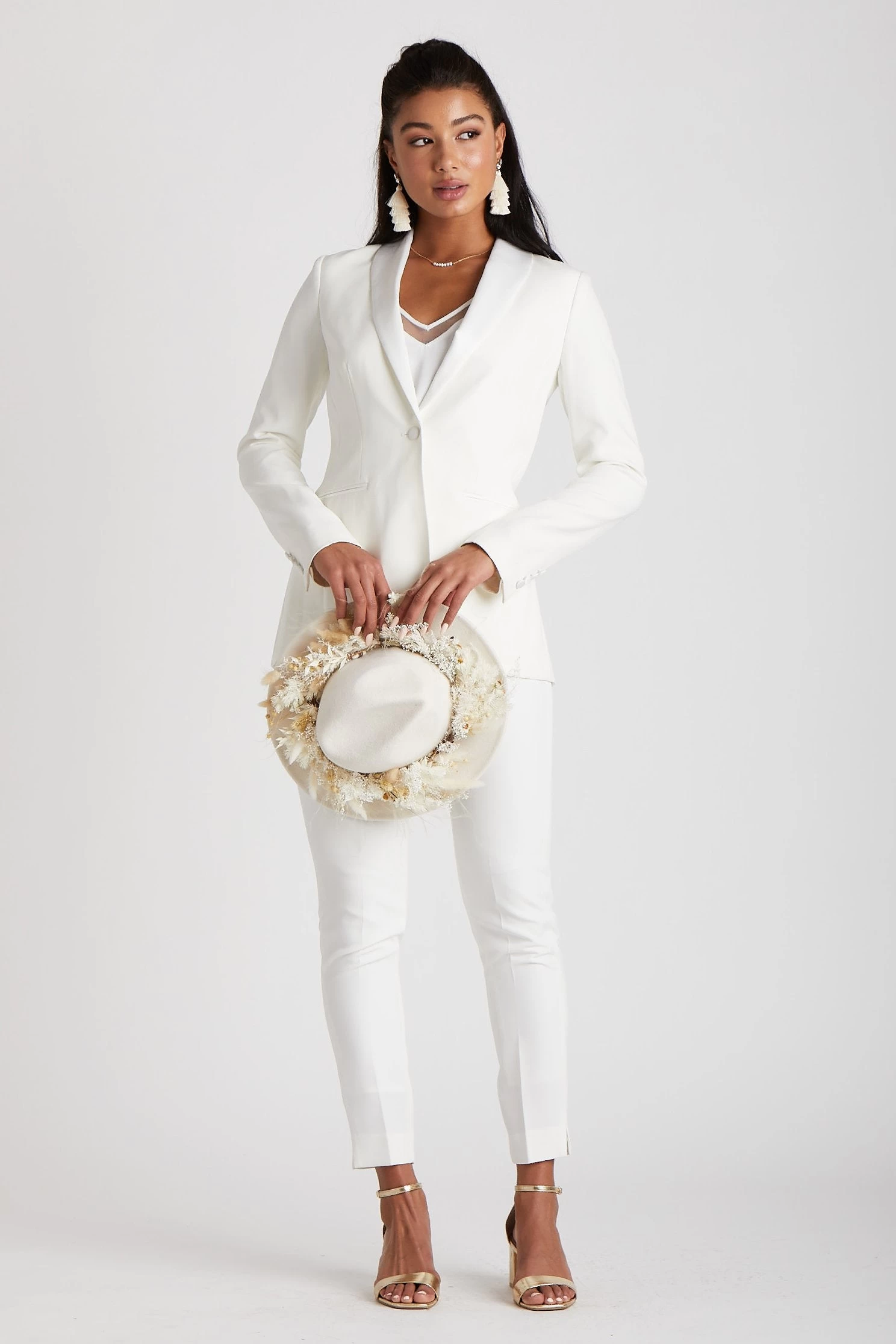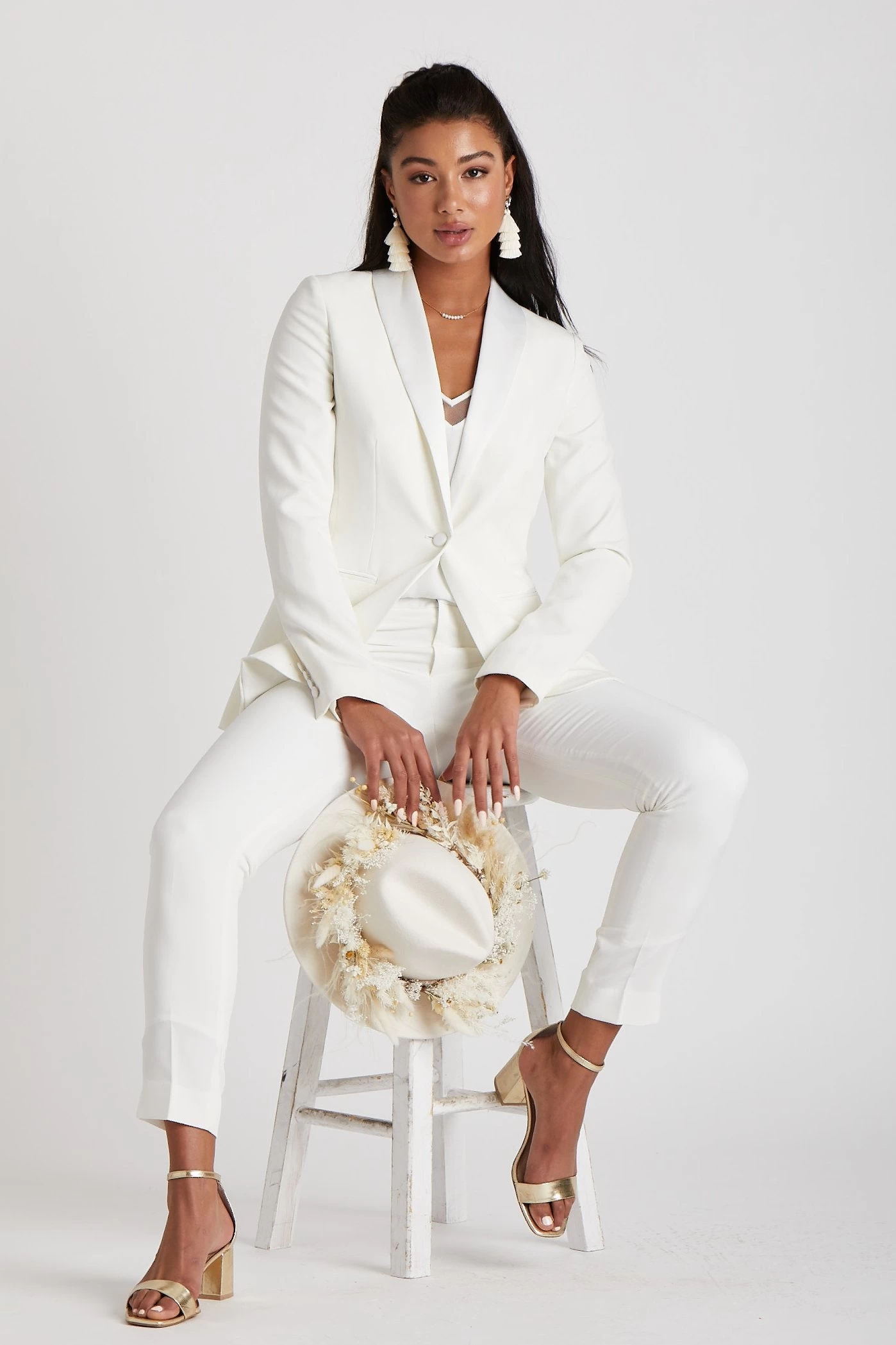 Look sharp with this classic white woman’s tuxedo by SuitShop. It features a beautifully tailored tuxedo jacket and tapered pants with a touch of stretch to make a statement on your wedding day… or in place of an LWD at the rehearsal dinner, bachelorette or any other bridal festivities. Â